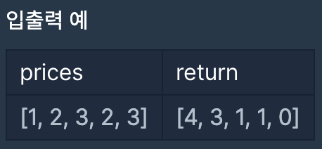 초 단위로 기록된 주식 가격이 담긴 배열 prices가 매개변수로 주어질 때, 가격이 떨어지지 않은 기간은 몇 초인지를 return 하도록 solution 함수를 완성하세요.