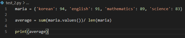 maria = {'korean': 94, 'english': 91, 'mathematics': 89, 'science': 83}