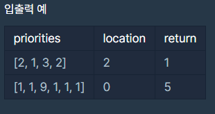 - location은 0 이상 (현재 대기목록에 있는 작업 수 - 1) 이하의 값을 가지며 대기목록의 가장 앞에 있으면 0, 두 번째에 있으면 1로 표현합니다.