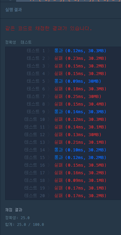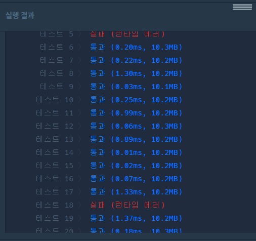 테스트 케이스 2번, 5번, 18번에서 런타임 에러가 발생한다.