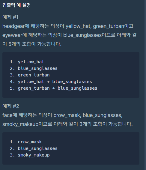 headgear = ["yellow_hat", "green_turban"] eyewear = ["blue_sunglasses"] headgear = ["yellow_hat", "green_turban", "입지 않는 경우"] eyewear = ["blue_sunglasses", "입지 않는 경우"]그럴 경우 경우의 수는 6가지가 되지만