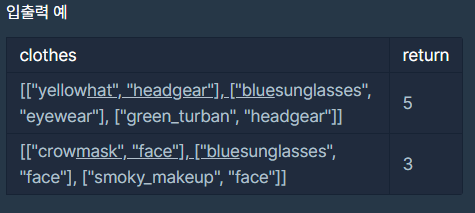 스파이가 가진 의상들이 담긴 2차원 배열 clothes가 주어질 때 서로 다른 옷의 조합의 수를 return 하도록 solution 함수를 작성해주세요.