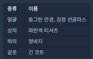 - clothes의 각 행은 [의상의 이름, 의상의 종류]로 이루어져 있습니다.