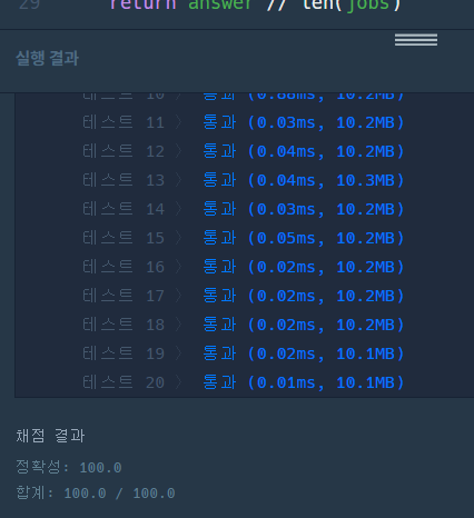 import heapq def solution(jobs): answer = 0 heapq.heapify(jobs) # 소요 시간 오름차순 정렬 sorted_list = sorted(jobs, key=lambda x:x[1]) # 리스트가 되어 heappop() 등 heapq 메소드 사용불가능 # print(sorted_list) # [[0, 3], [2, 6], [1, 9]] start = 0 for i in range(len(sorted_list)): if sorted_list[i][0] <= start: start += sorted_list[i][1] answer += start - sorted_list[i][0] return answer // len(jobs)