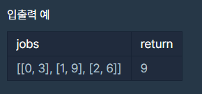 - jobs의 각 행은 하나의 작업에 대한 [작업이 요청되는 시점, 작업의 소요시간] 입니다.