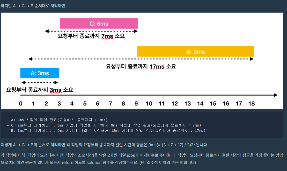 def solution(jobs): answer = 0 # 소요 시간 오름차순 정렬 sorted_list = sorted(jobs, key=lambda x:x[1]) # 리스트가 되어 heappop() 등 heapq 메소드 사용불가능 # print(sorted_list) # [[3, 3], [10, 3], [1, 10]] start = 0 while sorted_list: for i in range(len(sorted_list)): # 작업 시점이 start보다 크면 pass if sorted_list[i][0] <= start: start += sorted_list[i][1] answer += start - sorted_list[i][0] sorted_list.pop(i) break # 반복문을 모두 돌았을 경우에도! # 작업 시점 0초에 투입되는 시간이 없다면 start를 1 증가시켜줘야함 if i == len(sorted_list) - 1: start += 1 return answer // len(jobs)