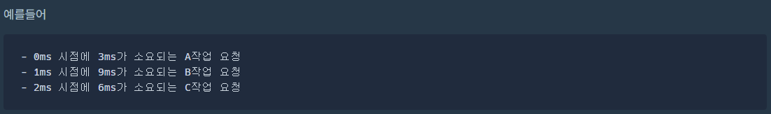 - 1ms 시점에 9ms 걸리는 작업 요청이 들어옵니다.