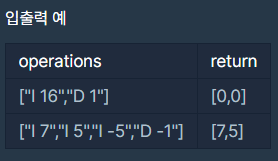 - 원소는 “명령어 데이터” 형식으로 주어집니다.- 최댓값/최솟값을 삭제하는 연산에서 최댓값/최솟값이 둘 이상인 경우, 하나만 삭제합니다.