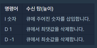 - 원소는 “명령어 데이터” 형식으로 주어집니다.- 최댓값/최솟값을 삭제하는 연산에서 최댓값/최솟값이 둘 이상인 경우, 하나만 삭제합니다.