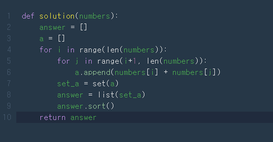 정수 배열 numbers가 주어집니다. numbers에서 서로 다른 인덱스에 있는 두 개의 수를 뽑아 더해서 만들 수 있는 모든 수를 배열에 오름차순으로 담아 return 하도록 solution 함수를 완성해주세요.