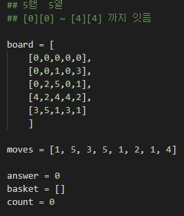 board = [[0, 0, 0, 0, 0], [0, 0, 0, 0, 0], [0, 0, 5, 0, 0], [0, 2, 4, 0, 2], [0, 5, 1, 3, 1]] 이 된다.추가로, 여기서는 basket은 stack구조로 같은 값의 값이 연속으로 쌓일 경우 두 값을 삭제하고 삭제된 갯수를 출력해야하하므로 바깥의 for 문이 작동하는 동안 basket에서도 if 문으로 연속으로 쌓인 두 값을 삭제해줘야 한다.