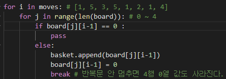 basket.append(board[j][i-1]) ## 해당 board 인덱스 번호의 값을 basket에 추가