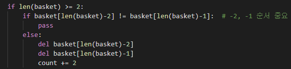 ## 같을 경우 basket 안의 해당 두 값을 삭제하고 카운트 에 +2 증가를 해준다.