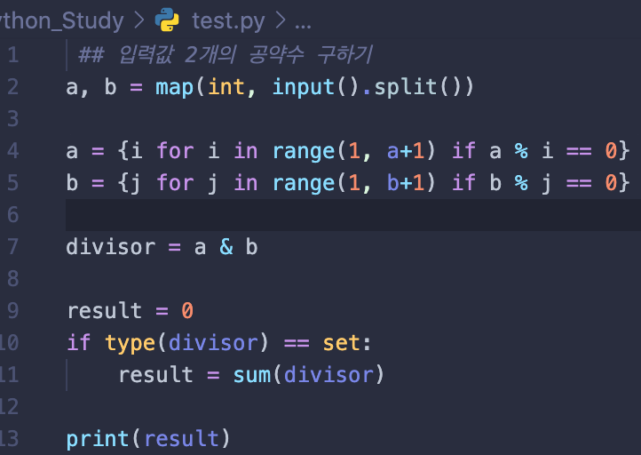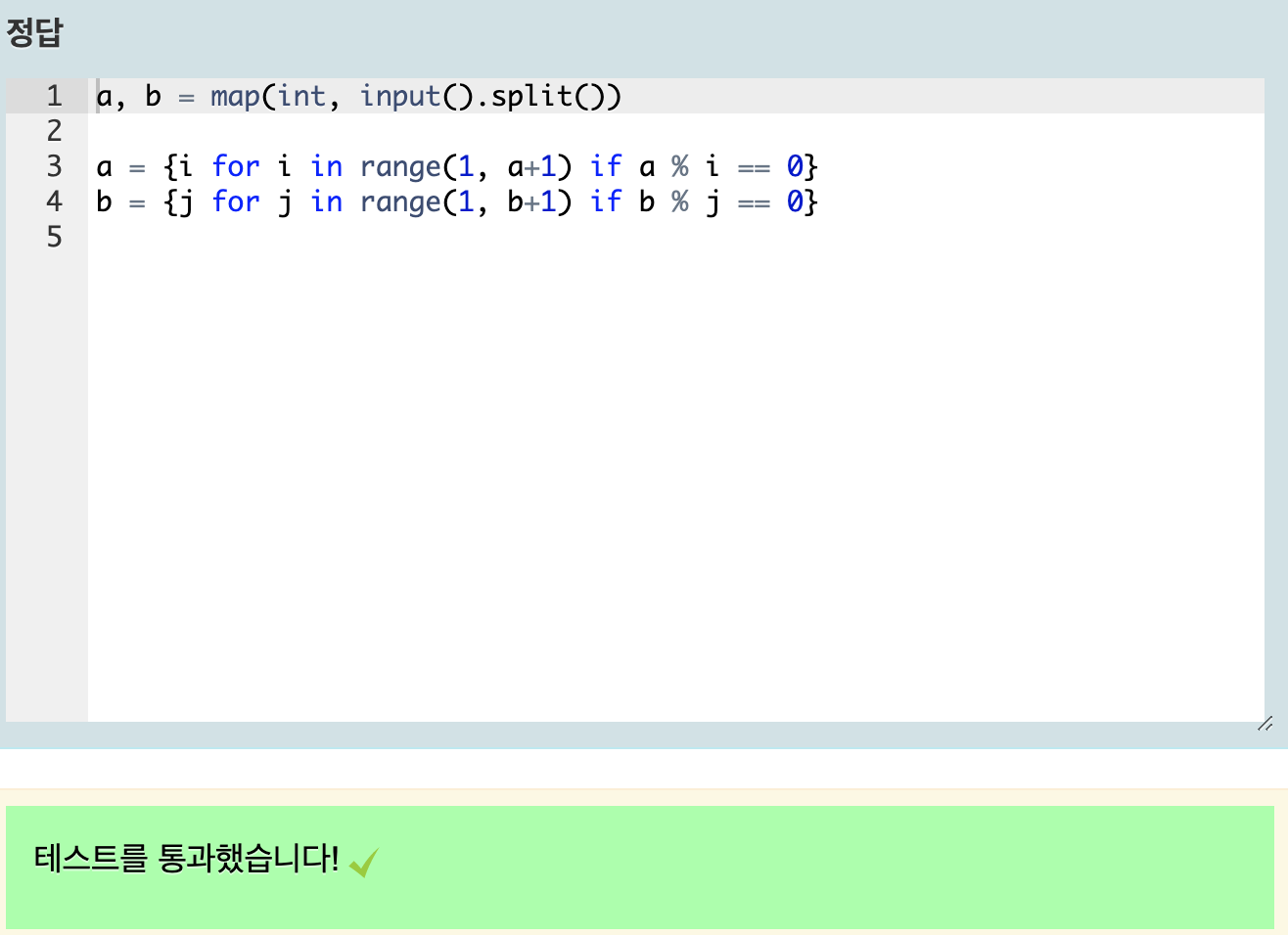 2. a , b 의 각각의 약수를 구하는 방법을 set 표현식으로 정해준다.