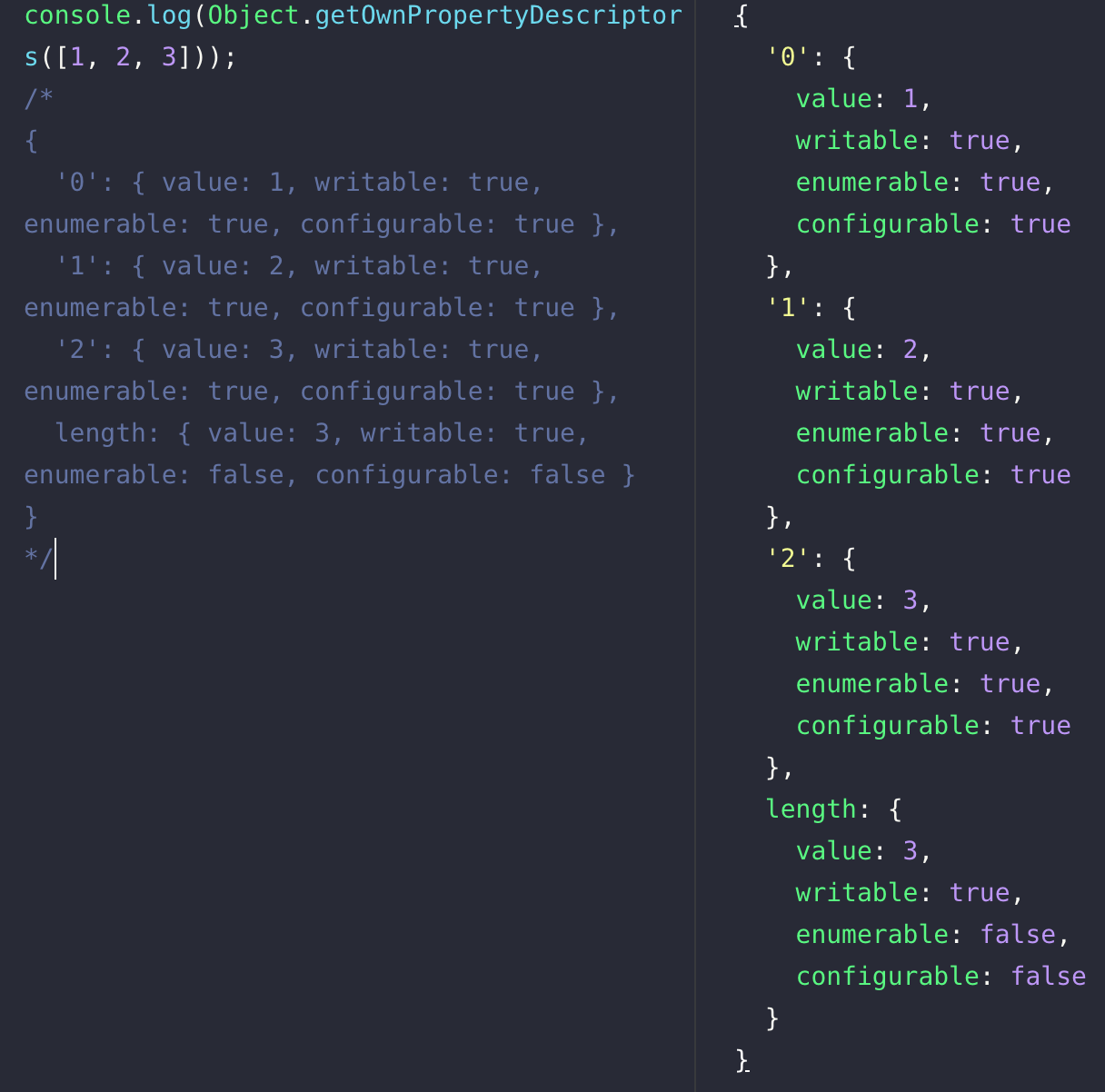 console.log(Object.getOwnPropertyDescriptors([1, 2, 3])); /* { '0': { value: 1, writable: true, enumerable: true, configurable: true }, '1': { value: 2, writable: true, enumerable: true, configurable: true }, '2': { value: 3, writable: true, enumerable: true, configurable: true }, length: { value: 3, writable: true, enumerable: false, configurable: false } } */아래와 같이 배열 [1, 2, 3]의 프로퍼티 값을 살펴보면 한 눈에 알 수 있다.