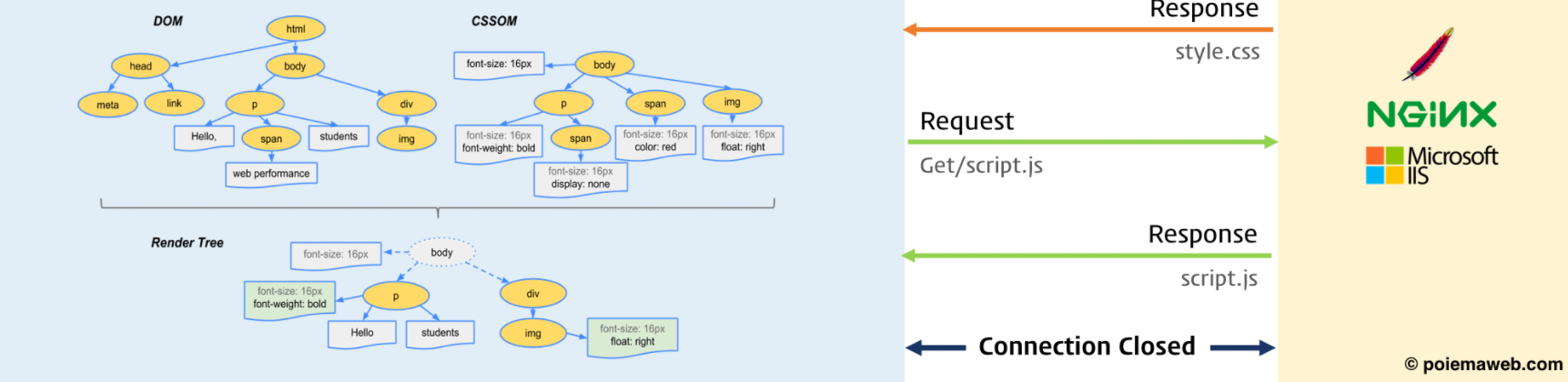 이렇게 생성된 DOM, CSSOM를 이용해 랜더 트리라는 결과물을 만들고 이 결과물을 브라우저에서 실행시켜 클라이언트가 보는 화면(뷰 포트)을 표시하게 된다