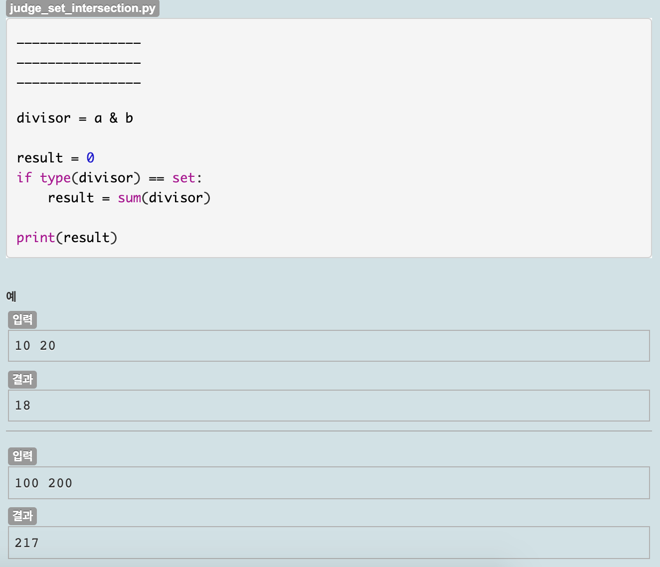표준 입력으로 양의 정수 두 개가 입력됩니다. 다음 소스 코드를 완성하여 두 숫자의 공약수를 세트 형태로 구하도록 만드세요. 단, 최종 결과는 공약수의 합으로 판단합니다.
