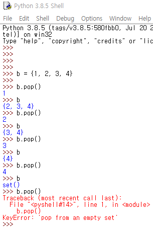 ## a.remove(3) ## set안에 3이라는 요소가 없는 상태이므로 error 발생