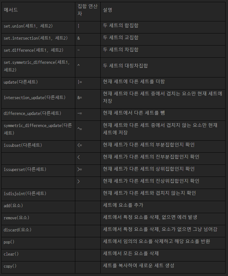 ## set 자료형에 |, &, -, ^ 연산자와 =(할당연산자)를 함께 사용하면 집합 연산의 결과를 다시 변수에 할당한다.
