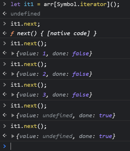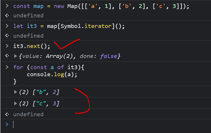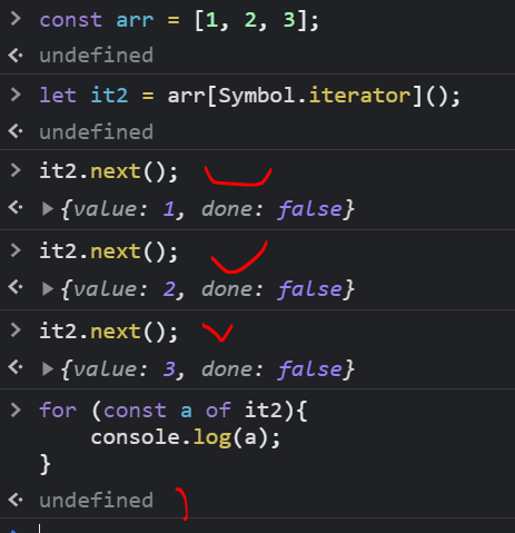 const arr = [1, 2, 3]; let it2 = arr[Symbol.iterator](); it2.next(); it2.next(); it2.next(); for (const a of it2){ console.log(a); }