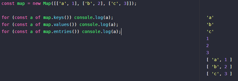 const map = new Map([['a', 1], ['b', 2], ['c', 3]]); for (const a of map.keys()) console.log(a); for (const a of map.values()) console.log(a); for (const a of map.entries()) console.log(a);