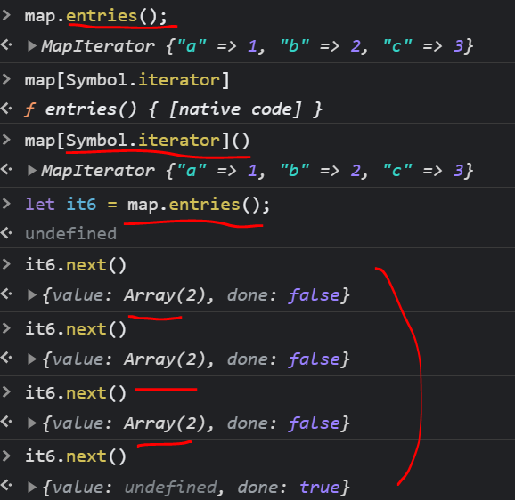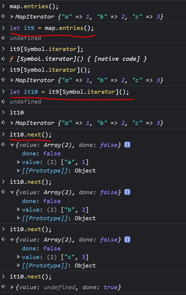 따라서 entries()로 만든 iterator를 Symbol.iterator()로 실행했을때 자기자신을 그대로 리턴하므로