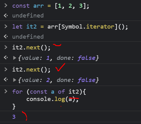 const arr = [1, 2, 3]; let it2 = arr[Symbol.iterator](); it2.next(); for (const a of it2){ console.log(a); }