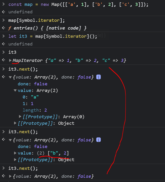 const map = new Map([['a', 1], ['b', 2], ['c', 3]]); console.log(map[0]); // undefined console.log(map[2]); // undefined즉, 기존 리스트 순회와 같은 방법과는 다른 방법을 통해 for of 문법이 동작함을 알 수 있다.