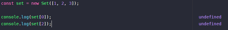 const set = new Set([1, 2, 3]); console.log(set[0]); //undefined console.log(set[2]); //undefined