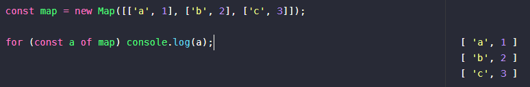 const map = new Map([['a', 1], ['b', 2], ['c', 3]]); for (const a of map) console.log(a);