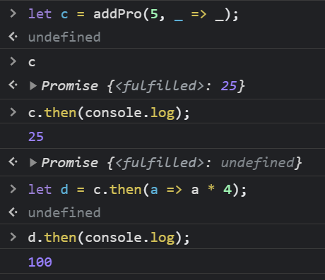 let AA = addCall(5, res => { addCall(res, res => { addCall(res, res => { console.log(res); }); }); }); let BB = addPro(5) .then(addPro) .then(addPro) .then(console.log); console.log(AA); console.log(BB);