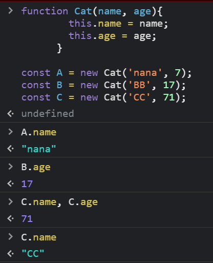 function Cat(name, age){ this.name = name; this.age = age; } const A = new Cat('nana', 7); const B = new Cat('BB', 17); const C = new Cat('CC', 71); console.log(A.name) console.log(B.age) console.log(C.name)