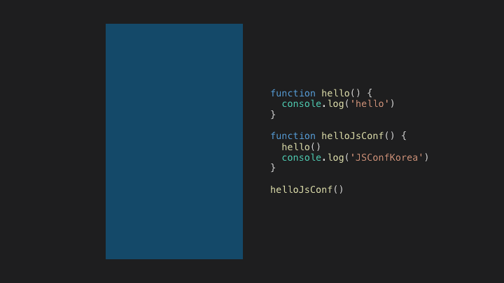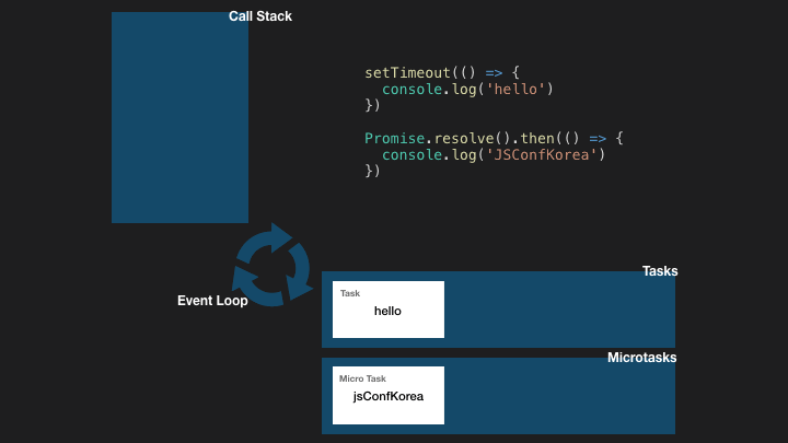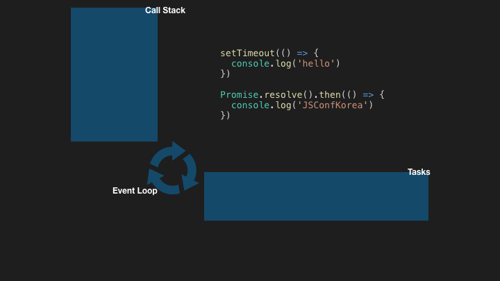 - ‘JSConfKorea’를 콘솔에 출력함으로써 console.log('JSConfKorea')는 스택에서 제거된다.