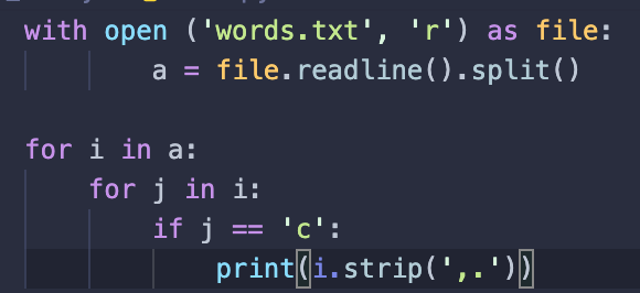 문자열이 저장된 words.txt 파일이 주어집니다(문자열은 한 줄로 저장되어 있습니다). words.txt 파일에서 문자 c가 포함된 단어를 각 줄에 출력하는 프로그램을 만드세요. 단어를 출력할 때는 등장한 순서대로 출력해야 하며 ,(콤마)와 .(점)은 출력하지 않아야 합니다.
