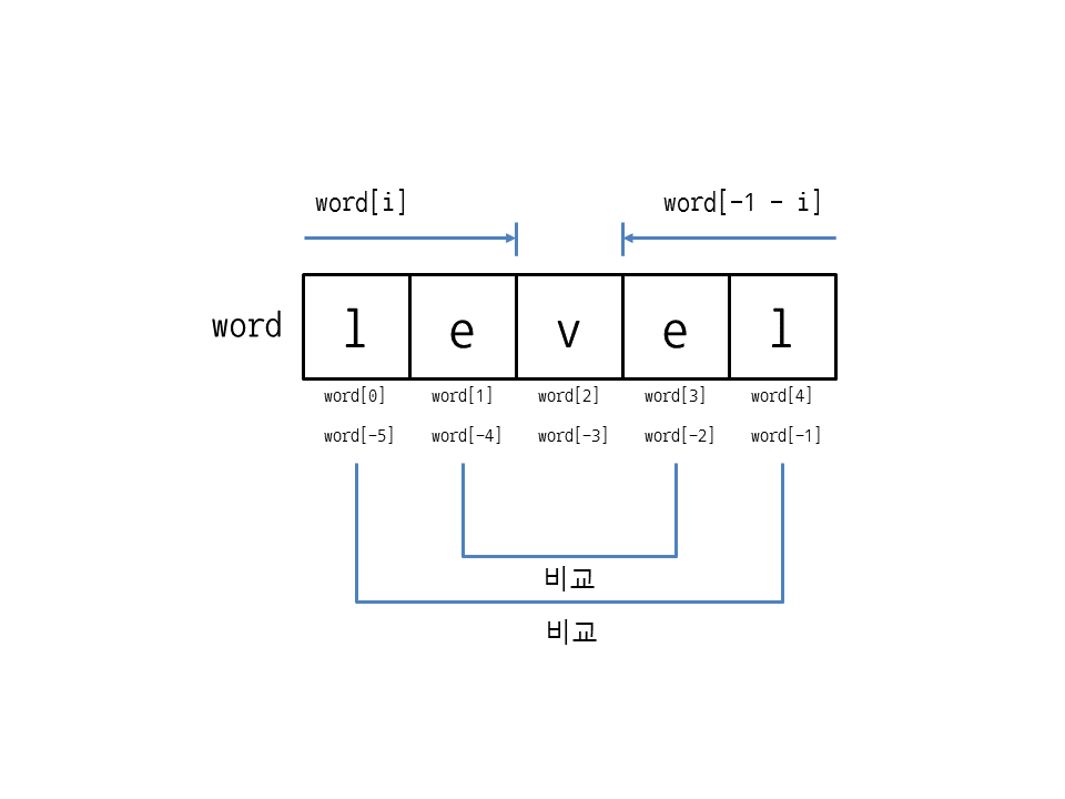 ## word[i] != word[-1-i] // word[0] (0으로 시작하는 인덱스번호), word[-1-0] == word[-1](-1을 기준으로 시작하는 인덱스번호)를 비교한다