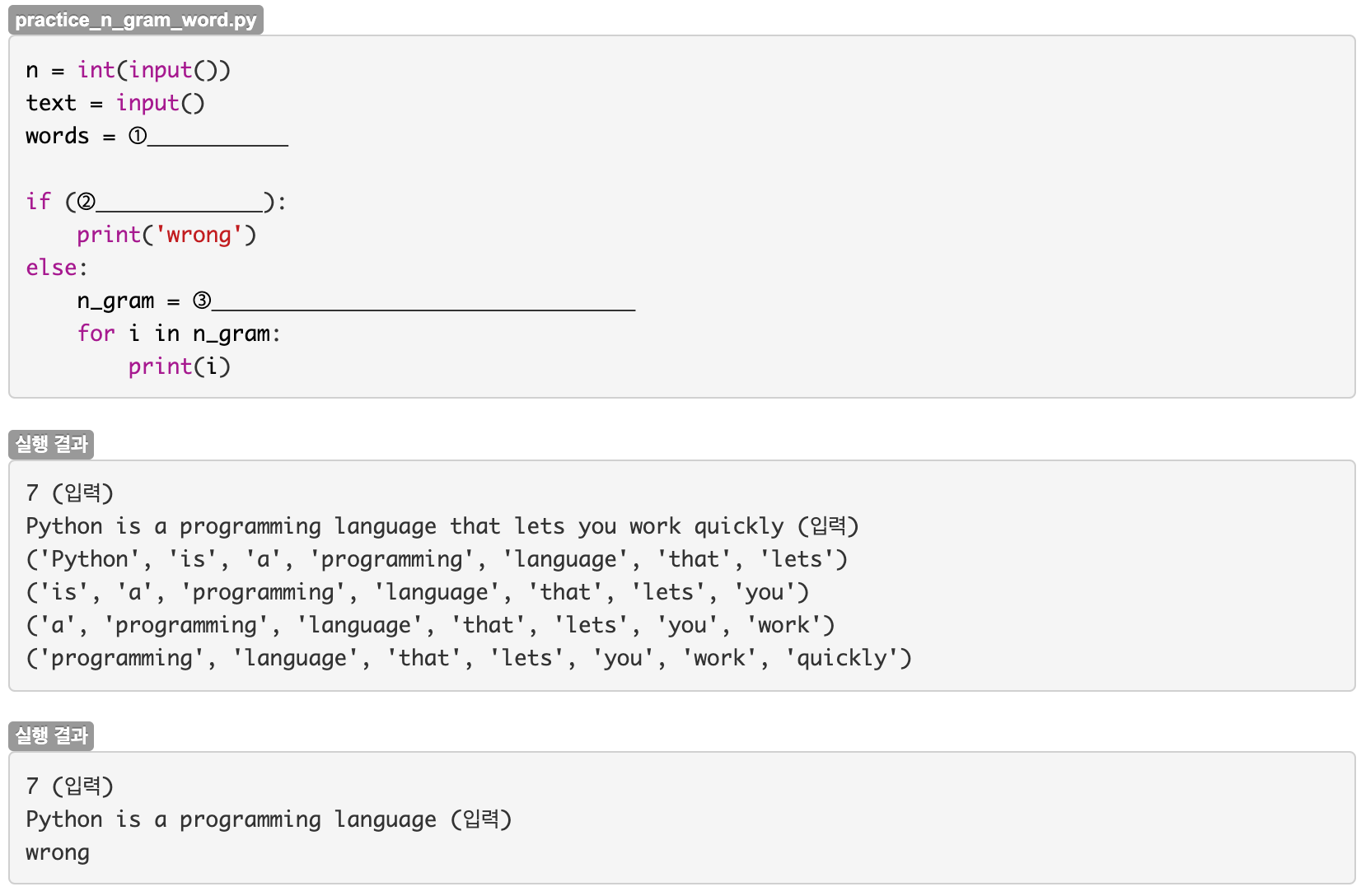 표준 입력으로 정수와 문자열이 각 줄에 입력됩니다. 다음 소스 코드를 완성하여 입력된 숫자에 해당하는 단어 단위 N-gram을 튜플로 출력하세요(리스트 표현식 사용). 만약 입력된 문자열의 단어 개수가 입력된 정수 미만이라면 'wrong'을 출력하세요.
