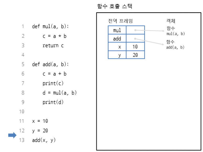 전역 프레임(global frame)에 함수 mul, 함수 add, 변수 x , y 가 들어간다