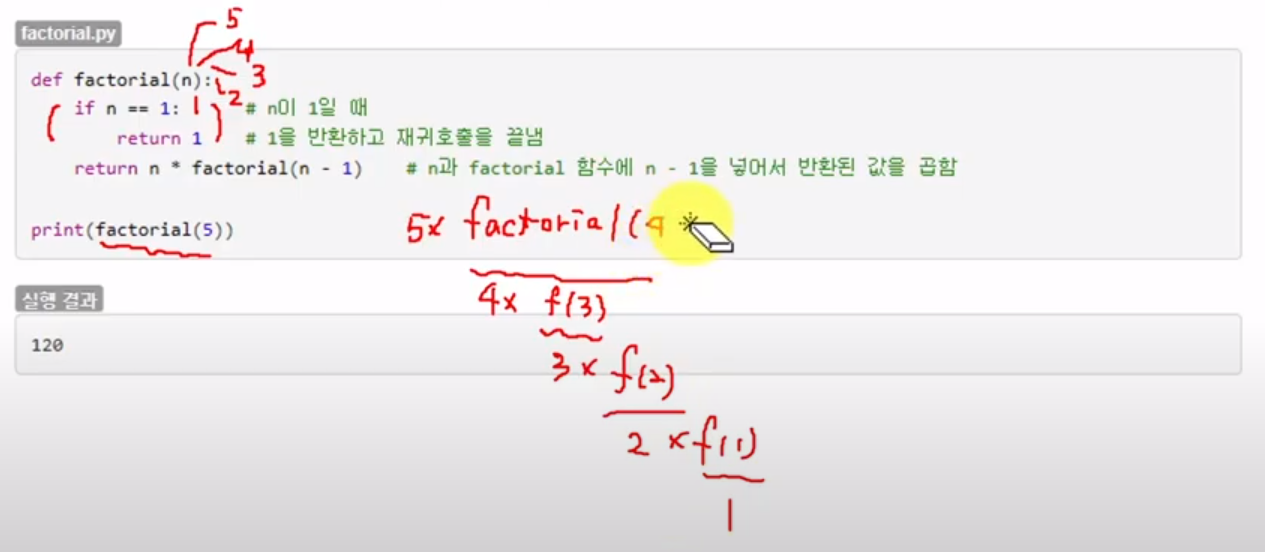 def factorial(n): if n == 1: return 1 return(n * factorial(n-1)) #return 위치 주의 print(factorial(5)) :: 1205! = 5 x 4 x 3 x 2 x 1 이다.