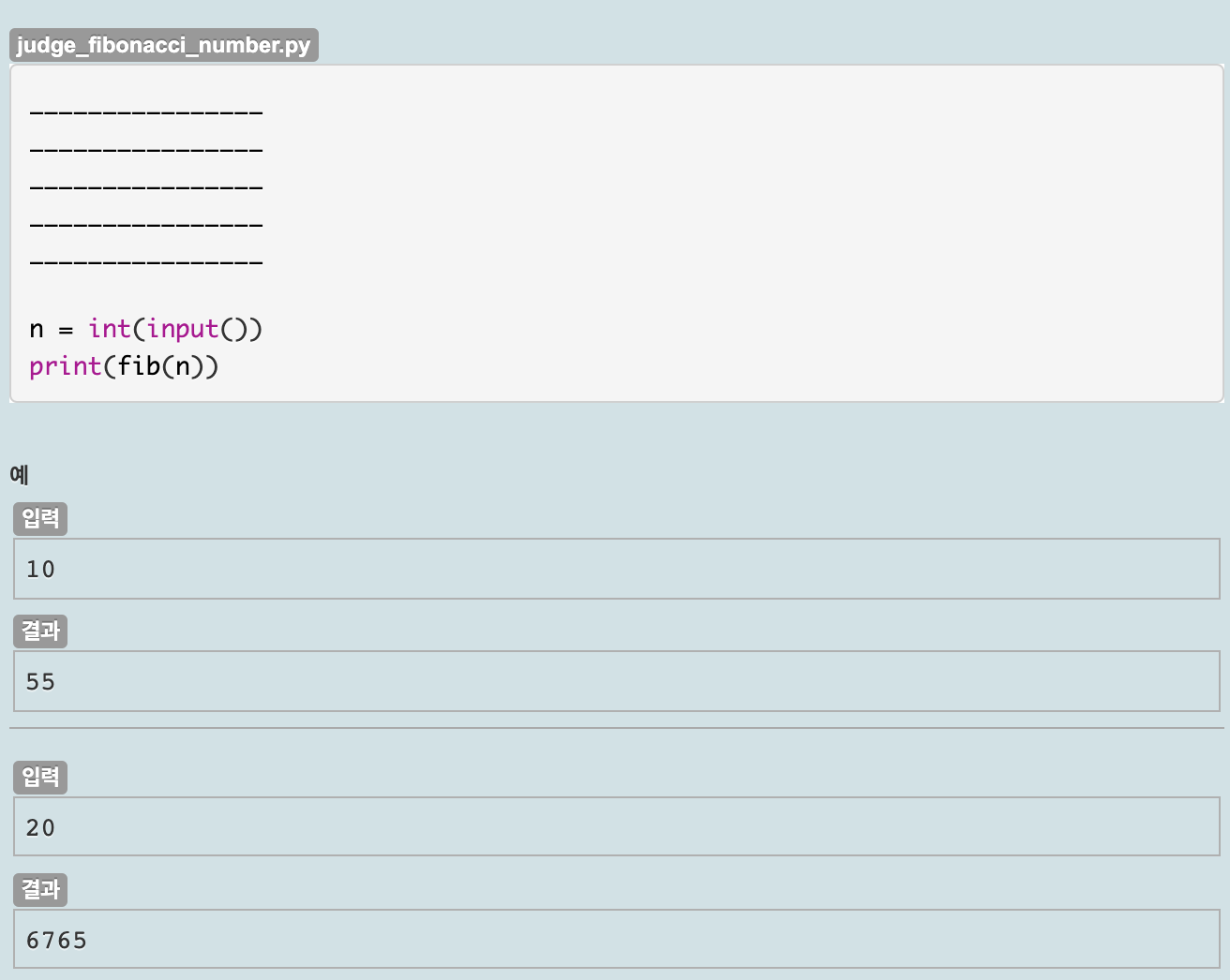 표준 입력으로 정수 한 개가 입력됩니다(입력 값의 범위는 10~30). 다음 소스 코드를 완성하여 입력된 정수에 해당하는 피보나치 수가 출력되게 만드세요.