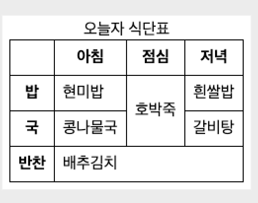 <!-- 표의 시각화를 위한 CSS 코드 --> <style> table { border-collapse: collapse; } th, td { border: 1px solid black; padding: 8px; } </style> </head> <body> <table> <caption>ㅇ식단표</caption> <tr> <td></td> <th scope="col">아침</th> <th scope="col">점심</th> <th scope="col">저녁</tH> </tr> <tr> <th scope="row">밥</th> <td>현미밥</td> <td rowspan="2">호박죽</td> <td>흰쌀밥</td> </tr> <tr> <th scope="row">국</th> <td>콩나물국</td> <td>갈비탕</td> </tr> <tr> <th scope="row">반찬</th> <td colspan="3">배추김치</td> </tr> <tr> <td> </td> </tr> </table> </body>