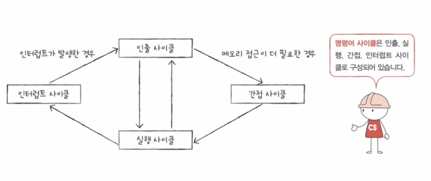 CPU는 명령어들을 하나씩 실행하는데 이때 프로그램 속 각각의 명령어들은 일정한 주기가 반복되며 실행되는데 이 주기를 명령어 사이클이라 한다.