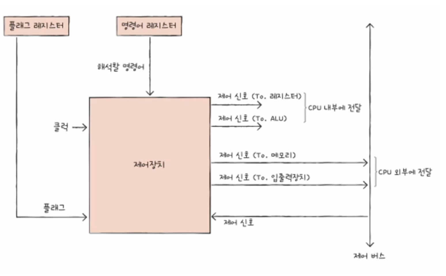 - 제어신호라는 전기신호를 내보내고 명령어를 해석하는 장치로 여기서의 제어신호랑 컴퓨터 부품을 관리하고 작동시키기 위한 일종의 전기 신호를 일컫는다.