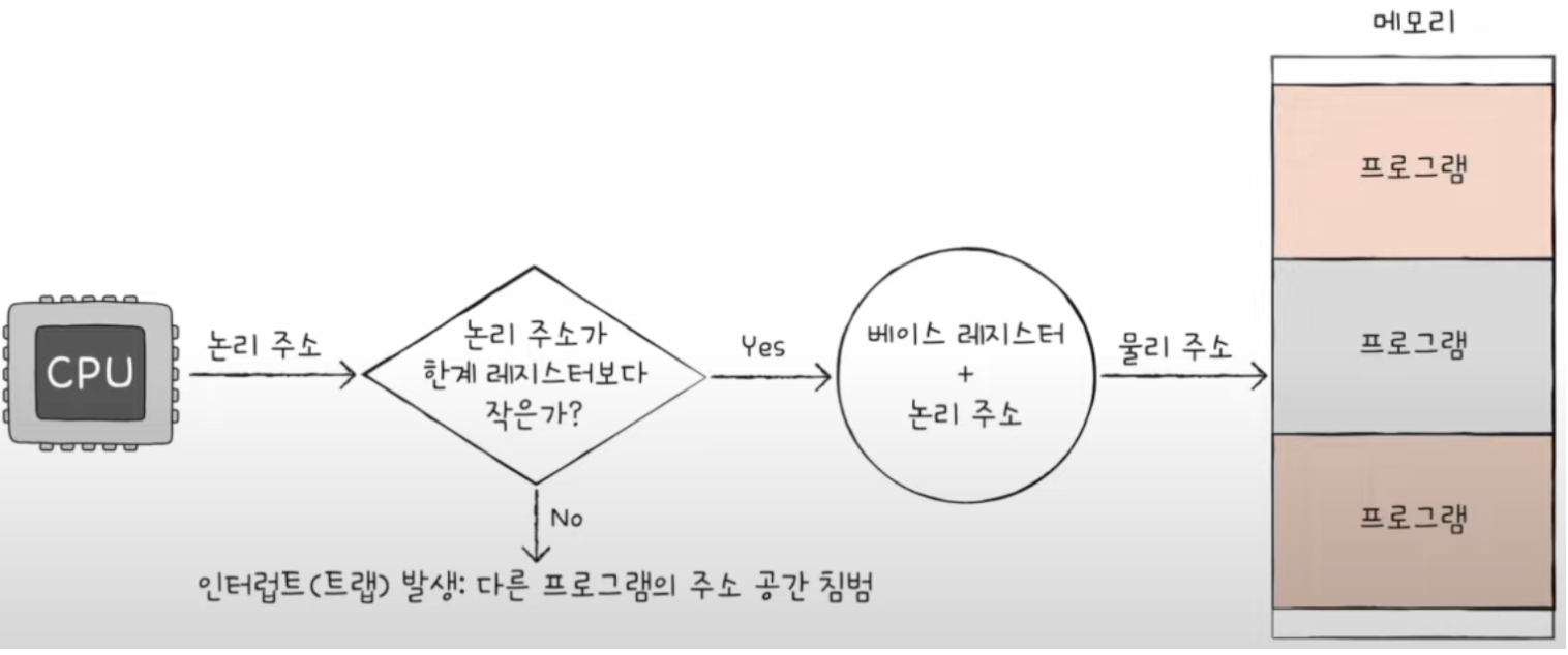 CPU는 메모리에 접근하기 전에 접근하고자하는 논리 주소가 한계 레지스터 보다 작은지를 항상 검사한다.