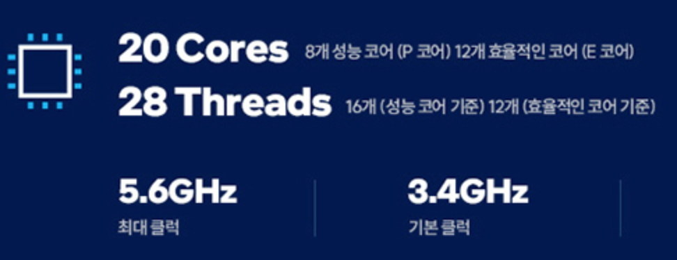 위 이미지의 20코어 28스레드는 명령어를 실행하는 부품이 20개 이고, 1번의 28개의 명령어를 처리할 수 있는 CPU를 의미한다.