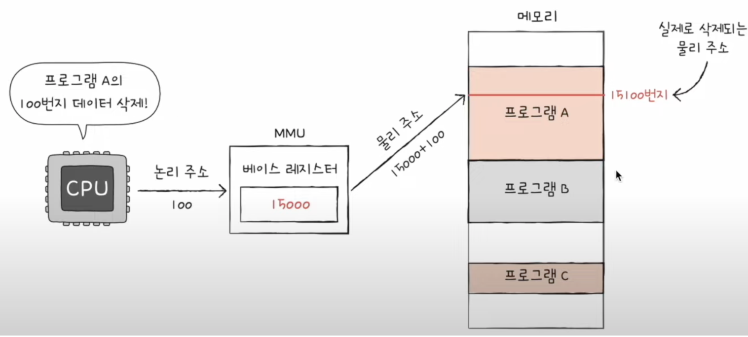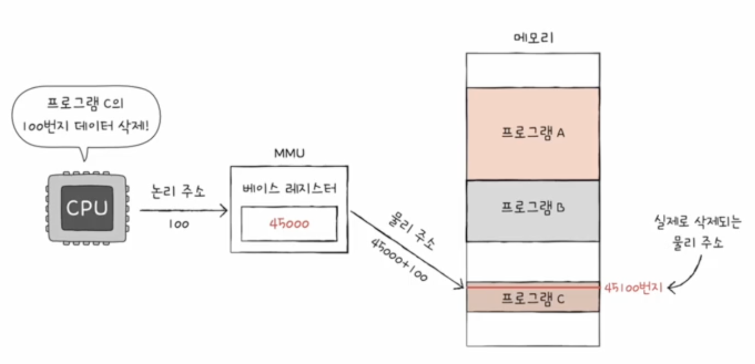 MMU는 CPU가 발생시킨 논리 주소에 베이스 레지스터 값을 더해 논리 주소를 물리 주소로 변환하다.
