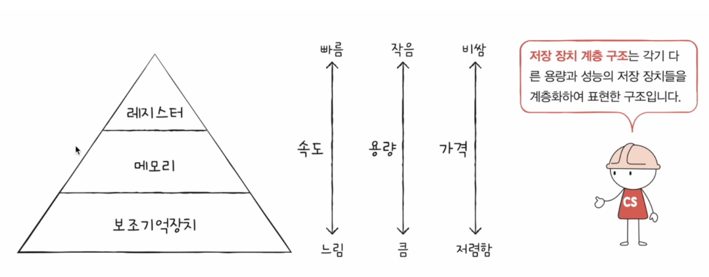 속도가 빠른 저장 장치는 저장 용량이 적고, 가격이 비싸다.저장 장치들을 CPU에 얼마나 가까운가를 기준으로 아래 계층으로 나눌 수 있는데, 이를 저장 장치 계층 구조라 한다.