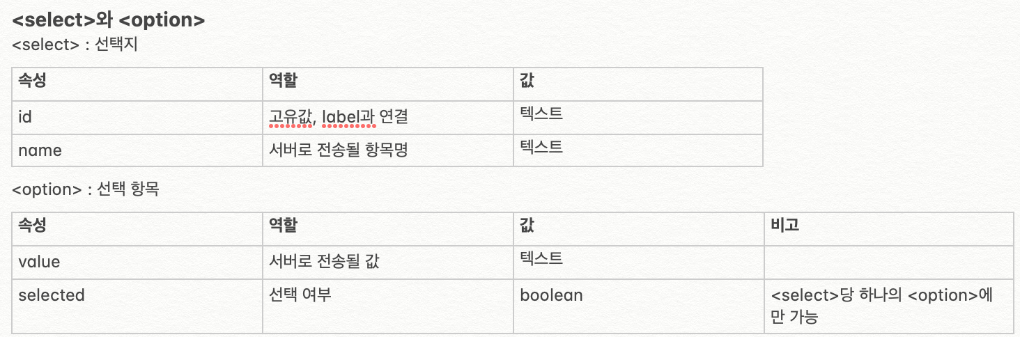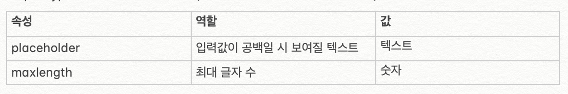 <style> form { line-height: 1.5em; margin: 36px 24px; } input, select { font-size: 0.9rem; } button { font-size: 1rem; } label { margin-right: 8px; vertical-align: top; } </style> </head> <body> <label for="ip-name">이름</label> <input id="ip-name" type="text" placeholder=" 니이름? 4글자까지만됨" maxlength="4"> <br> <label for="ip-pw">비번</label> <input id="ip-pw" type="password" placeholder="비밀번호 8자리까지만" maxlength="8"> <br> <br> <label for="ip-age">나이</label> <input id="ip-age" type="number"> <br> <label for="ip-Ww">기혼</label> <input id="ip-Ww" type="checkbox" checked> <br> <label>역할</label> <input id="ip-dev" name="role" type="radio" checked> <label for="ip-dev">개발자</label> <input id="input-design" name="role" type="radio"> <label for="input-design">디자이너</label> <input id="ip-pm" name="role" type="radio"> <label for="ip-pm">매니저</label> <br> <label for="ip-file">첨부</label> <input id="ip-file" type="file" multiple> <br> <br> <label for="sel-dp">소속팀</label> <select id="sel-dp"> <option value="adm">운영팀</option> <option value="mkt">마케팅팀</option> <option value="frt">프론트엔드팀</option> <option value="bck">백엔드팀</option> <option value="tst">테스트팀</option> <option value="mnt">유지보수팀</option> </select> <br> <br> <label for="text-1">소개</label> <textarea id="text-1" rows="5"></textarea> <br> <br> <button type="button">제출</button> <button type="button" disabled>취소</button> </body>