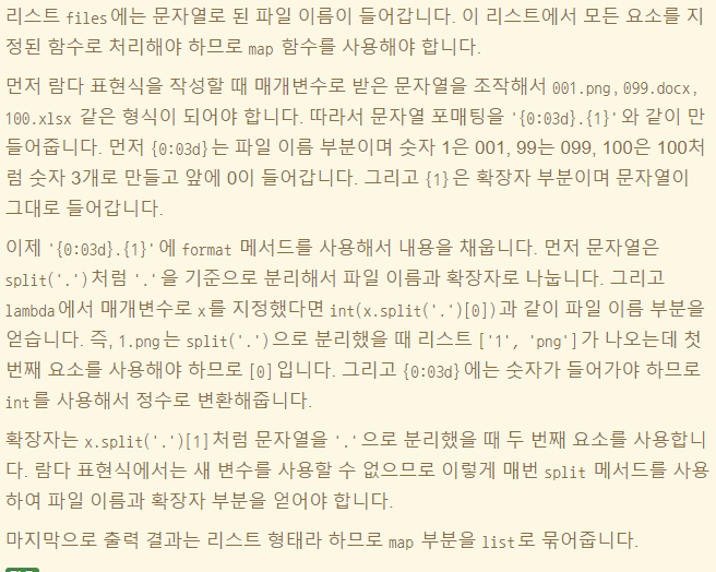 x = '10.png' a = x.split('.') print(a) :: ['10', 'png'] # x[0] = 숫자 // x[1] = 확장자list(map(lambda x : '{0:03d}'.format(int(x.split('.')[0]))+ '.' + x.split('.')[1], files))여섯 번째 : format 메서드와 x.split의 값의 결과 [0]번째 인덱스를 앞부분