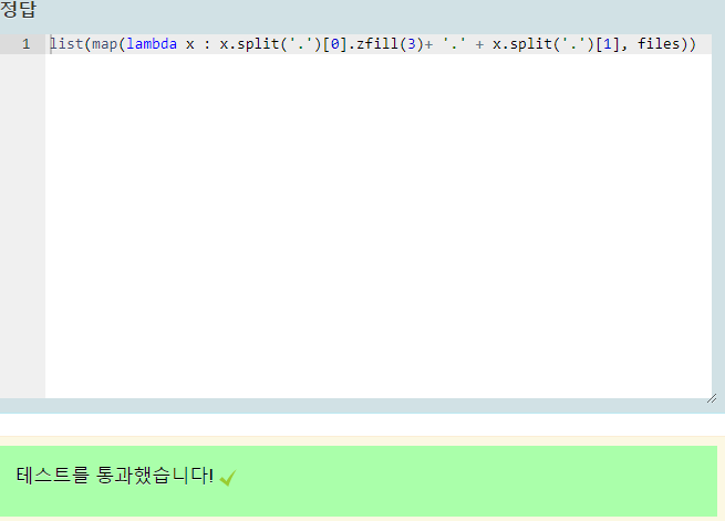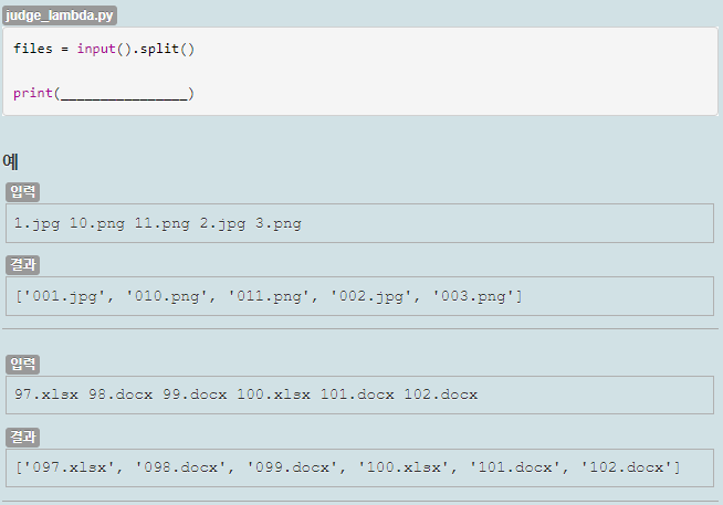 표준 입력으로 숫자.확장자 형식으로 된 파일 이름 여러 개가 입력됩니다. 다음 소스 코드를 완성하여 파일 이름이 숫자 3개이면서 앞에 0이 들어가는 형식으로 출력되게 만드세요. 예를 들어 1.png는 001.png, 99.docx는 099.docx, 100.xlsx는 100.xlsx처럼 출력되어야 합니다. 그리고 람다 표현식을 사용해야 하며 출력 결과는 리스트 형태라야 합니다. 람다 표현식에서 파일명을 처리할 때는 문자열 포매팅과 문자열 메서드를 활용하세요.