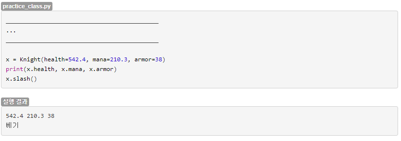 class Knight: def __init__(self, health, mana, armor): self.health = health self.mana = mana self.armor = armor def slash (self): print('베기') x = Knight(health=542.4, mana=210.3, armor=38) print(x.health, x.mana, x.armor) :: 542.4 210.3 38 x.slash() :: 베기728x90반응형'코딩도장 심사문제모음' 카테고리의 다른 글